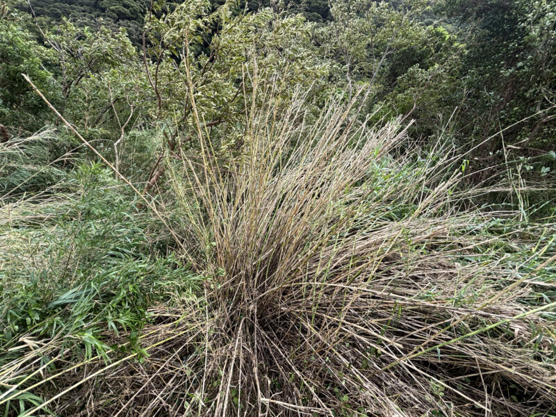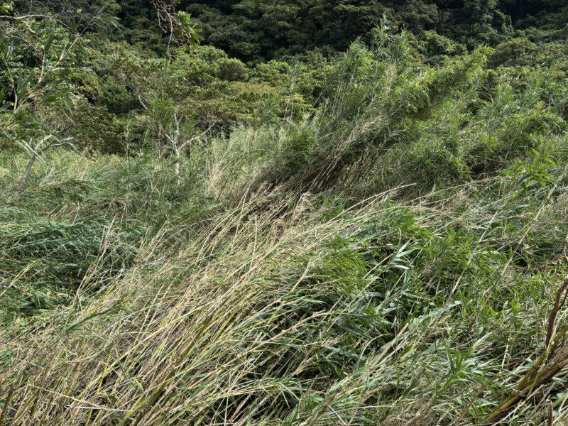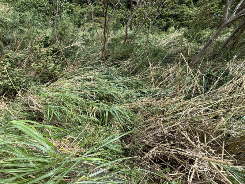 台風22号が来る前は垂直に伸びていたササや木は、風の猛威によって同じ方向に倒れていることが分かります。