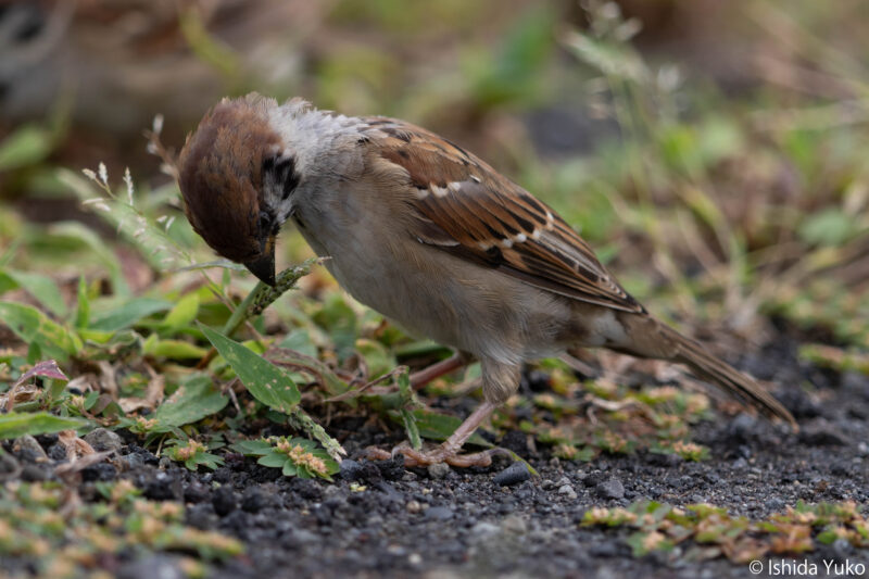 秋になりますと、イネ科植物の種が豊富になります。スズメは短いくちばしを使って丁寧に種を食べます。
