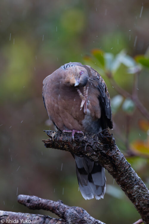 キジバトは、他の野鳥と異なり、雨の日でもよく観察できます。土砂降りなのに餌を食べたりしていますし、そうかと思えば木に止まって雨を凌いだりします。