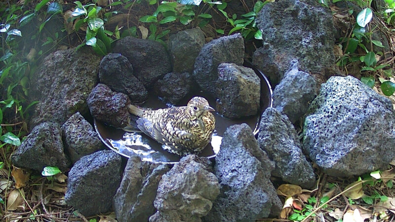 トラツグミはさらにレアです。しかし、トレイルカメラは何度か写しており、この水浴び場では希少種ではなくなりました。