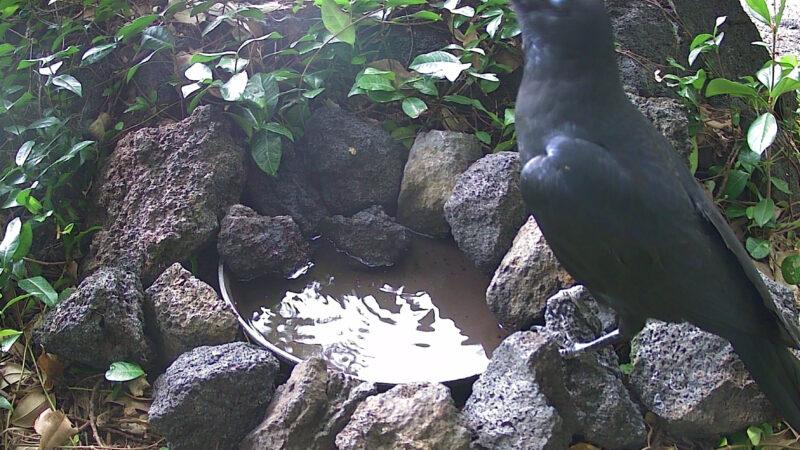 ハシブトガラスは大型の野鳥です(57 cm)。どうしても居心地の良い広い水浴び場へ移ってしまうようです。
