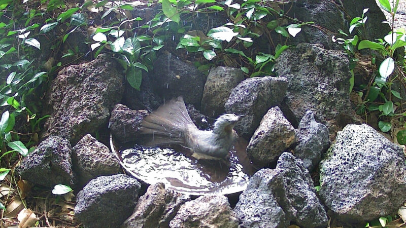ヒヨドリはキジバトに次ぐ水浴び場の常連です。トレイルカメラで観察しますと、水を飲むだけの個体と水を飲んで水浴びをする個体に分かれます。
