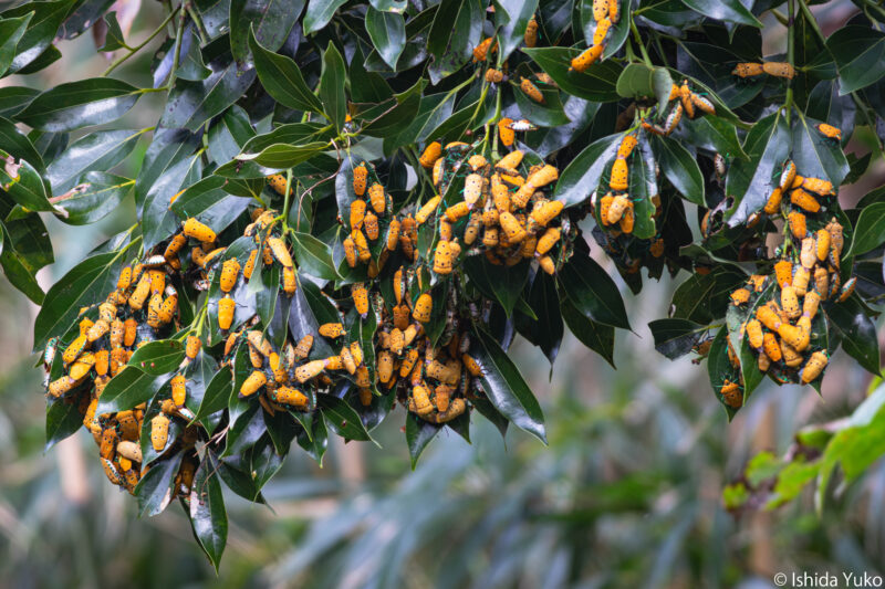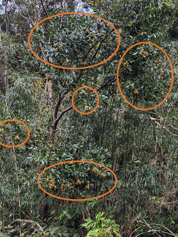 ヤブニッケイ オレンジ線に囲まれた部分がオレンジ色の花や実に見えた。