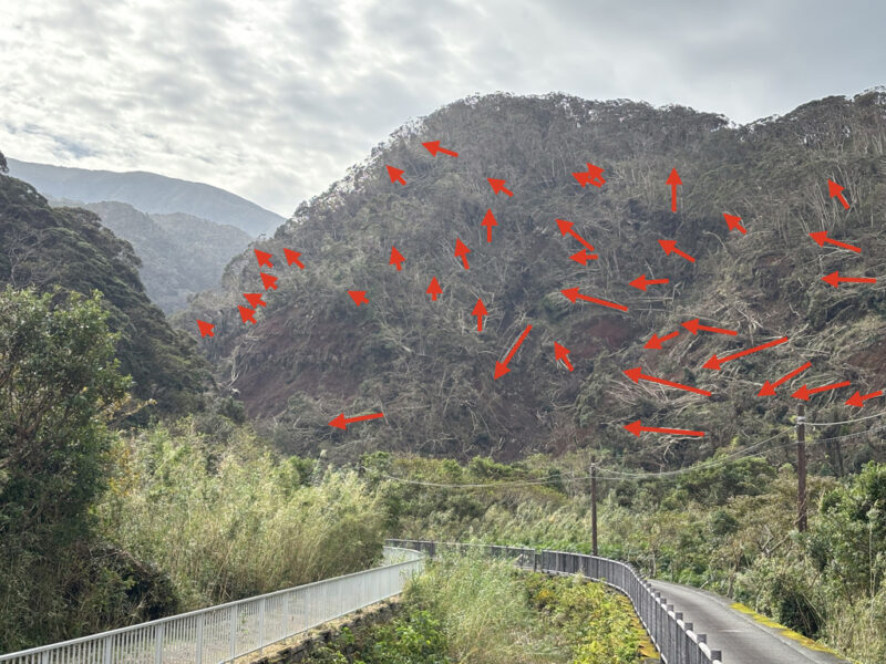 倒木の向きは変わっていませんので、倒木の向きに重ねて矢印を描き、台風22号直撃当時の風向を推測してみました。