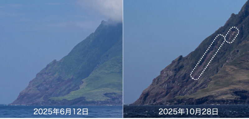 例えば、八丈島から見て向かって左側の斜面。2025年6月12日と2025年10月28日の写真を見比べますと、斜面が大きく崩れているのが分かりました。