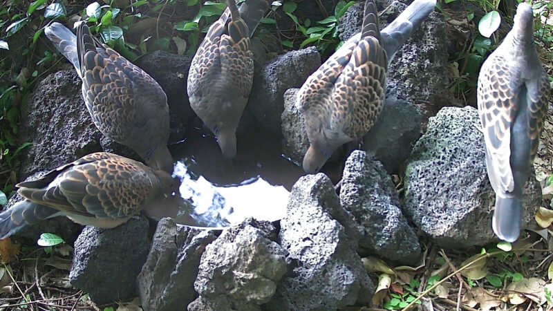 なんと常連のキジバトが新たに仲間を4羽も連れて来ていたのです。体の大きいキジバトがゴクゴクと水を飲んでしまうのですから、水が無くなってしまうのも納得でした。