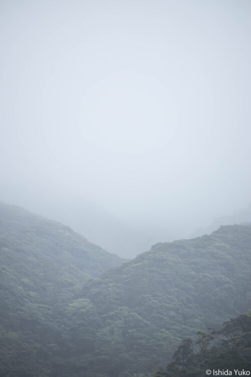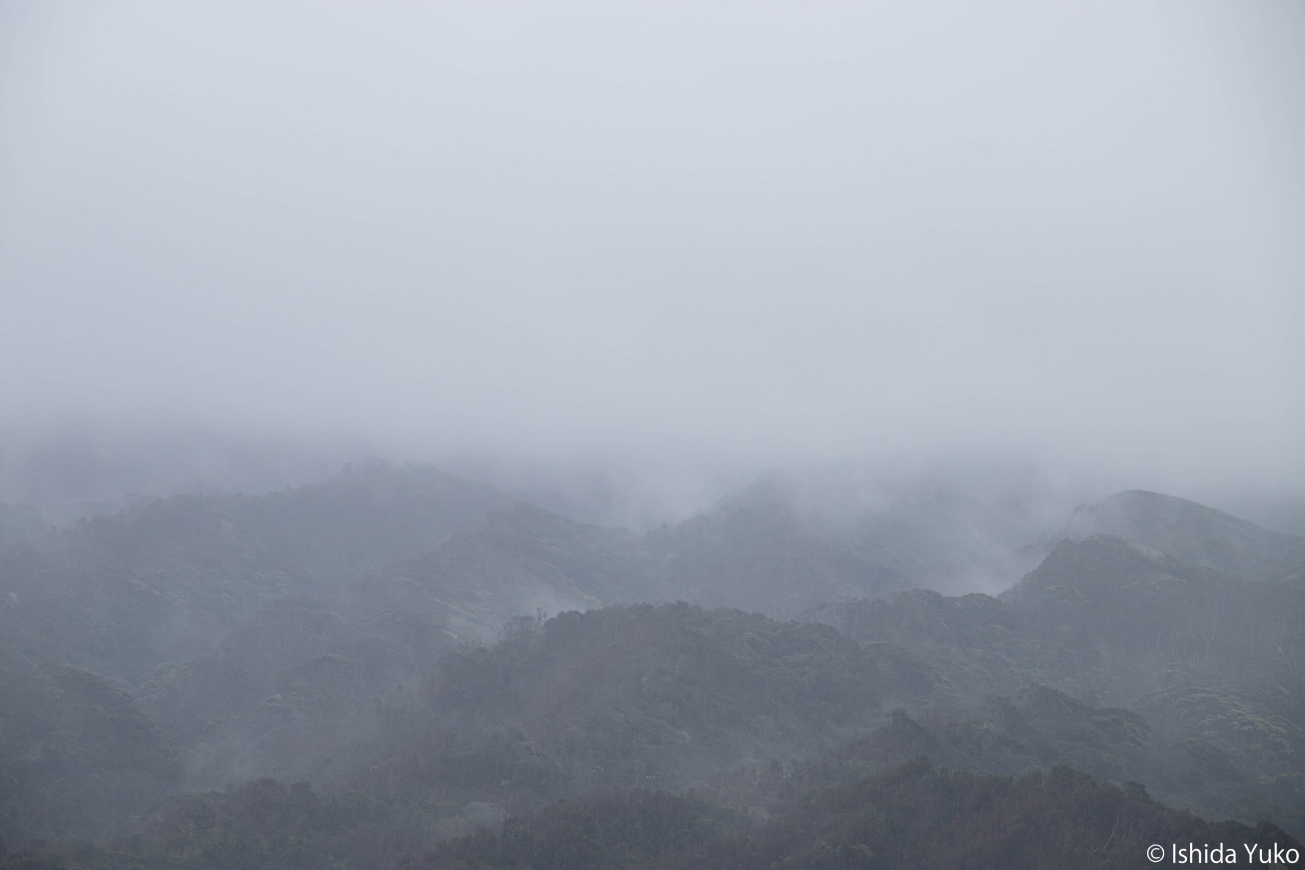 私が、カメラを持ったのはその後です。霧が少し晴れ、山の木々がかすかに見え始めました。
