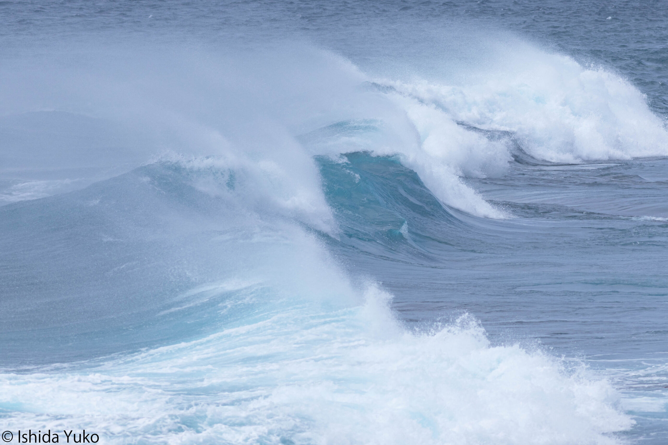 台風19号が直撃している訳ではありませんが、八丈島は時折風が吹いていました。海はうねりが見られ、砕波が起きる瞬間に強風が吹き、水しぶきが広がっていました。