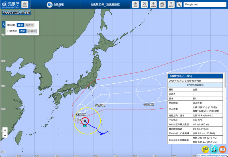 2025年10月7日15:45の気象庁から発表された現在の台風22号は、中心気圧960 hPa、中心付近の最大風速40 m/s、瞬間最大風速60 m/s。