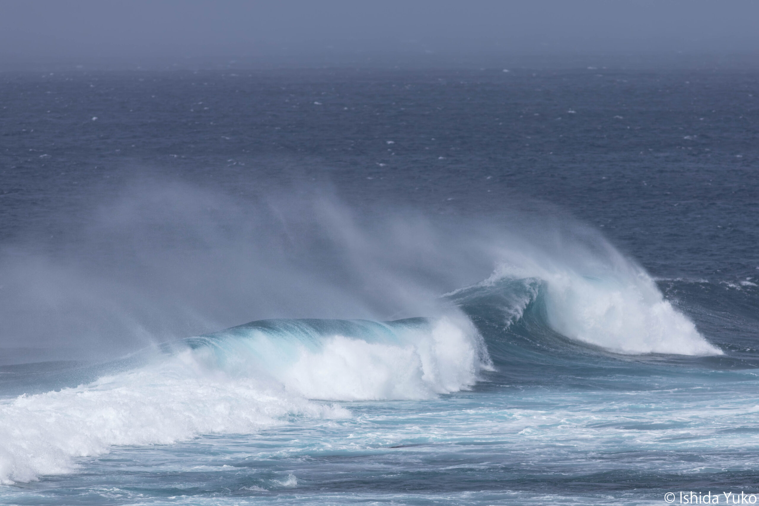 写真では波の大きさは伝わりづらいですが、八丈島に向かってきた波の波頂に強風があたり、水しぶきが高く舞い上がっていました。
