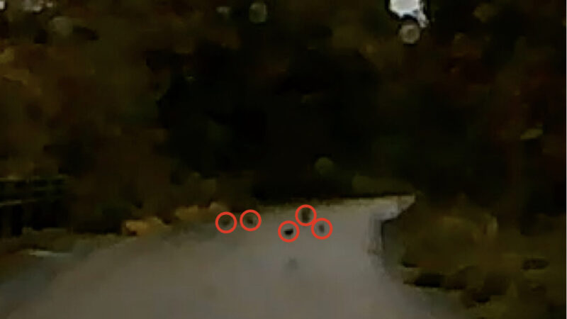 画素数の低いドライブレコーダーの静止画を拡大したもので、とても見づらい写真となってしまいましたが、道路のど真ん中に集まっているのがキジバトです。