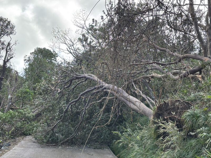 キジバトの行動や植物の全ての葉を奪い取る強風の跡から、今回の台風の勢力の強さを紹介しました。