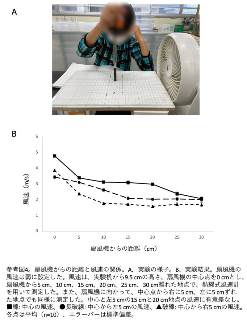 その結果、扇風機から15-20 cm離れ、中心から左5 cmのところで再現性良く風速が測定できることが分かりました。