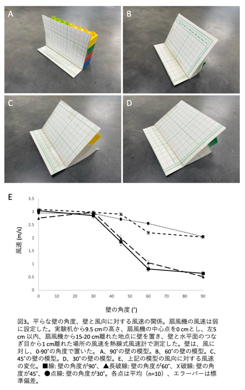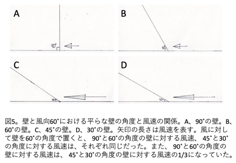平らな壁の角度、模型の壁に対する風の角度と風速の面白い関係