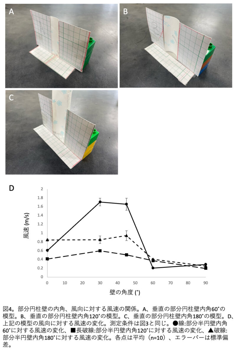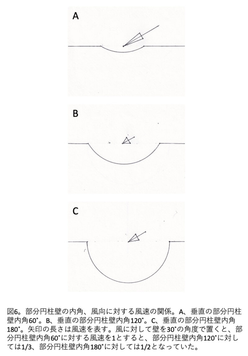 ドーム型の壁の弧の角度の大きさ、模型の壁に対する風の角度と風速の面白い関係