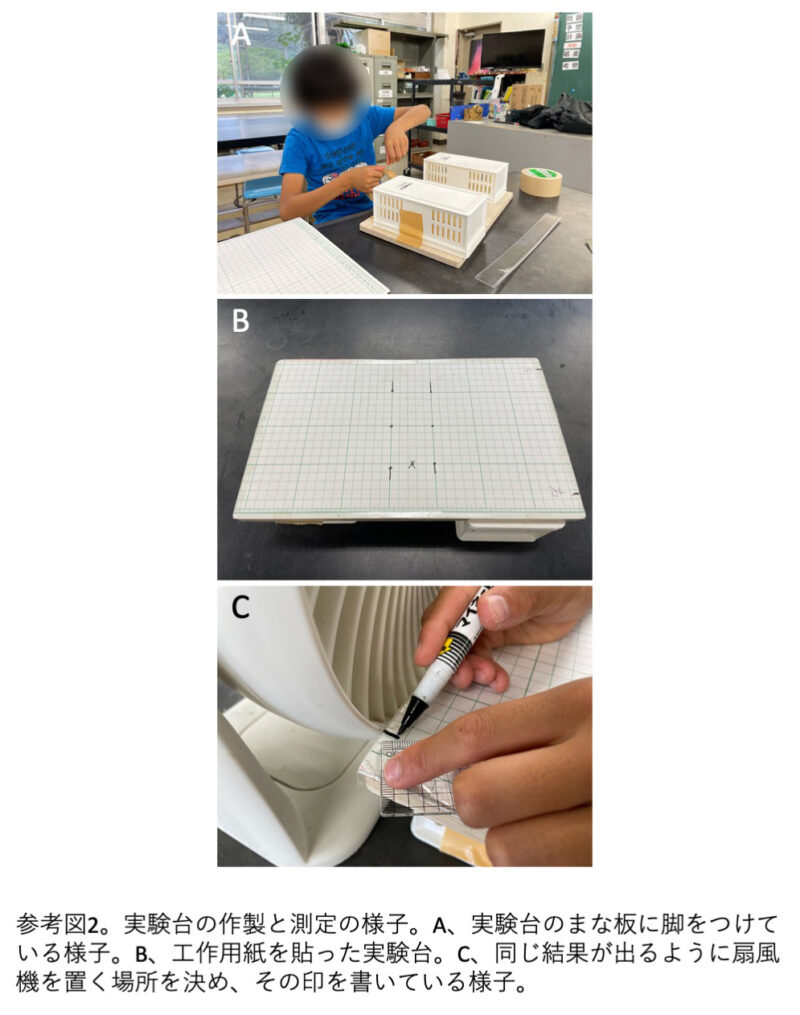 プラスチック製の台の上にガムテープで板を付け、台上模型の位置を再現性良くのせるために工作用紙を貼りました。さらに、扇風機の位置をいつも同じにするために台と扇風機に記しを付けました。