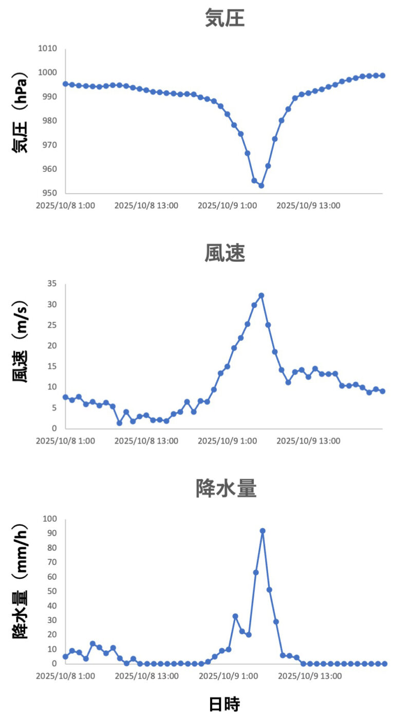 風速は2025年10月8日23:00に9.5 m/s。ここから風速が上がり始め、2025年10月9日6:00で一番速い32.3 m/sとなり、そこから下がり始めました。最大瞬間風速は5:30に記録した北東の風54.7 m/s。