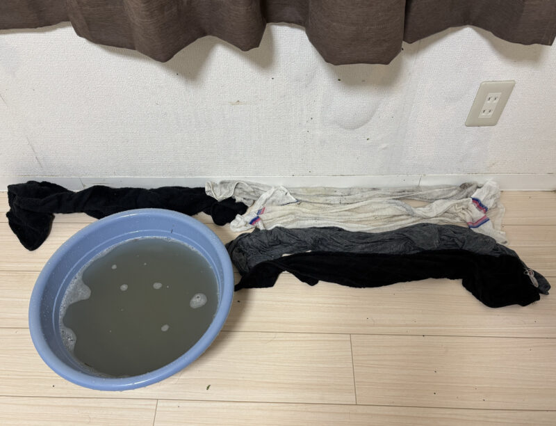 タオルに水を吸わせ、タライに絞りました。満杯になった水を3回捨てました。