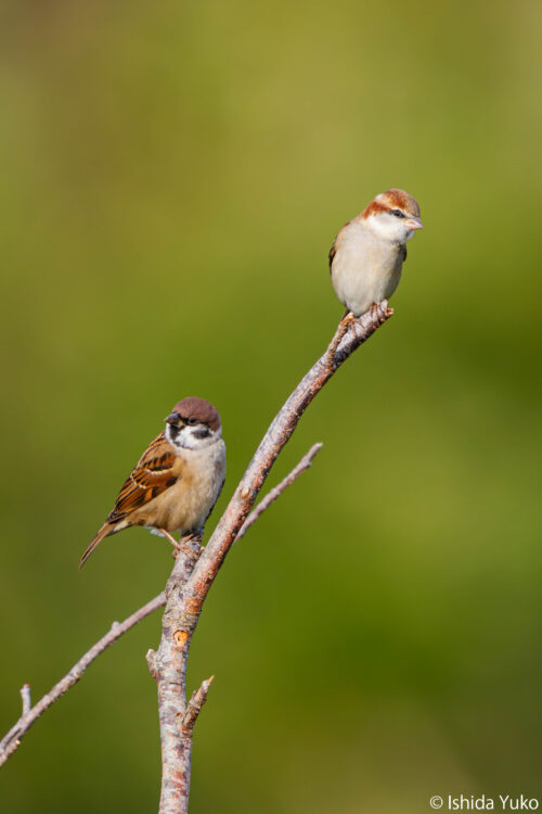 そして、運良く順光の位置でスズメと一緒に枝に止まりました。