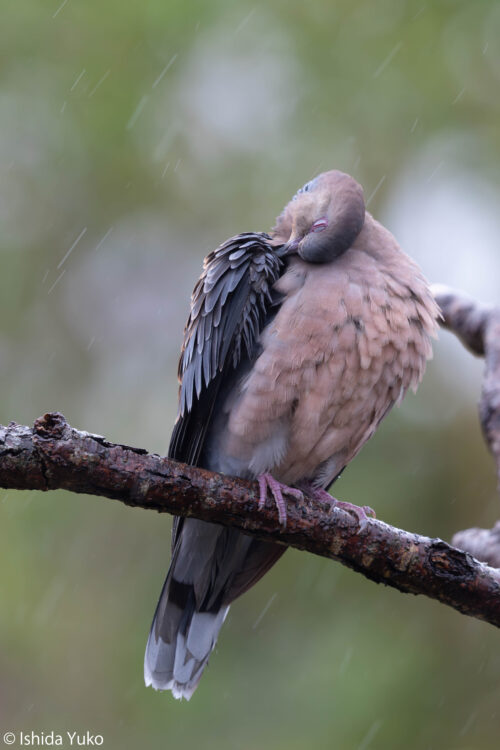 今日は曇りの予報でしたが、実際は断続的に雨が降っていました。雨にも関わらず、キジバトは羽繕いをしていました。