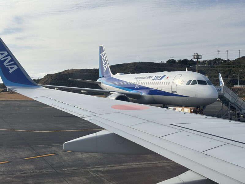 八丈島出発当日は珍しいことに八丈島空港に2機の飛行機が見られました。写真の奥に写っている飛行機は、機材故障のため八丈島‐羽田が欠航した前日の3便になります。